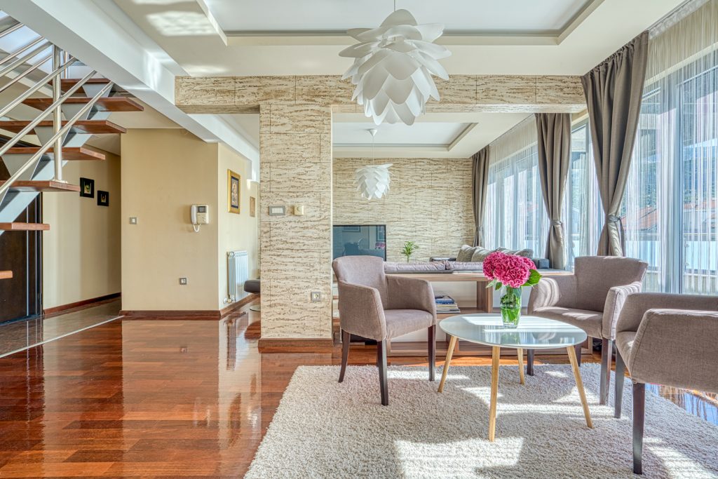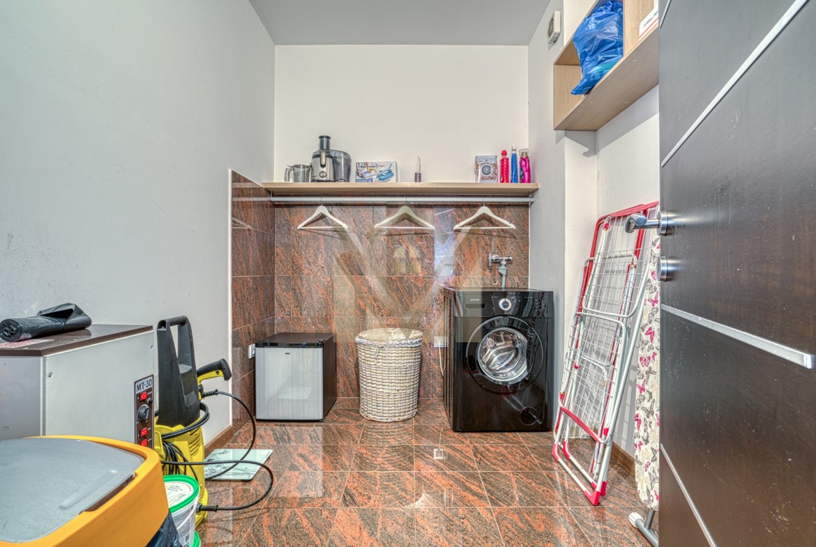 Üst düzey işçilik ve birinci sınıf malzemeler iç mekanı tanımlıyor: banyolarda Geberit ve Hansgrohe armatürleri ve yerden ısıtma sistemi bulunuyor, tüm odalarda merkezi ısıtma ve bireysel klima sistemi mevcut, egzotik Afrika kiraz ağacı (merbau) parke zemin ve koridorlarda, mutfakta ve çamaşırhane alanında çok renkli Brezilya granit fayanslar kullanılmış.